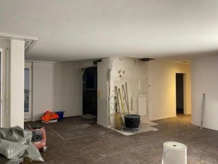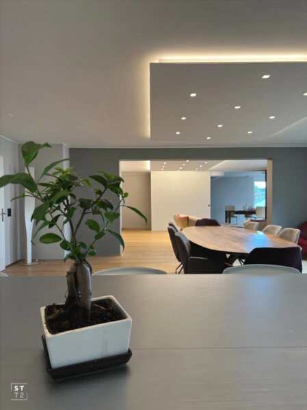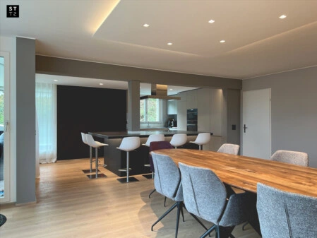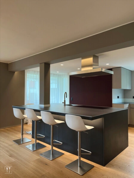 Zusammenlegen von zwei Wohnungen auf gleicher Stockwerkhöhe. Anpassung der tragenden Wände für ein grosszügigen Wohn- und Essbereich mit offener modernen Küche. Umbau des Badezimmers.
